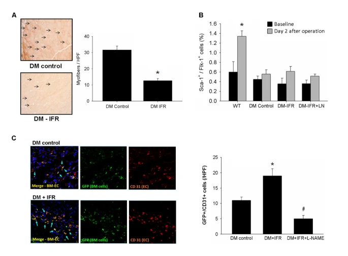 為了測試重複的IFR輻射對骨髓源性EPC歸巢和分化為內皮細胞的影響,STZ誘導的糖尿病在接受eGFP小鼠骨髓細胞的FVB小鼠中產生。通過免疫螢光染色,IFR組的STZ誘導的糖尿病小鼠在缺血肌肉中有比對照組更多的GFP+/CD31+雙陽性細胞(對照與IFR相比:11.2 ± 1.1對18.8 ± 2.0/HPF,p = 0.007,n = 6;圖2)。此外,eNOS抑製劑的給予顯著減少了IFR輻射對EPC歸巢的影響。這些結果表明,重複的IFR治療在組織缺血後並未促進EPC的動員,但可能增加外周血中EPCs對缺血組織的歸巢。