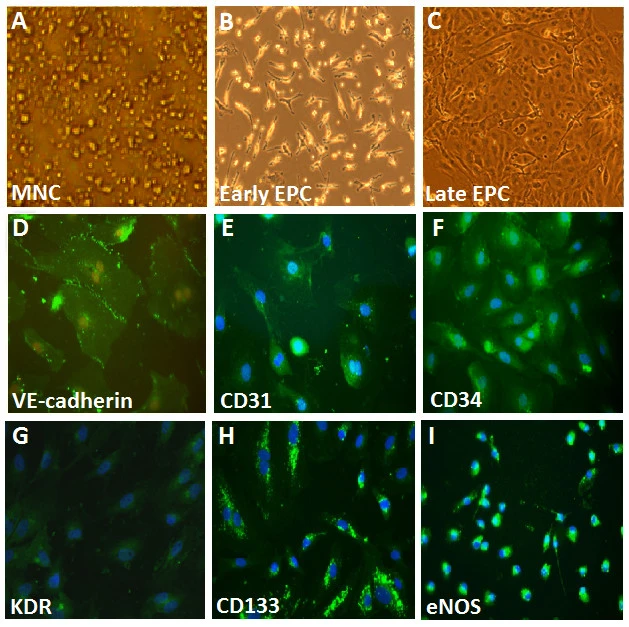 (D-I) ECFC的特性是通過免疫組織化學染色來進行的。大部分的EPC表達內皮和造血幹細胞標記,如VE-cadherin、PECAM-1 (CD31)、CD34、KDR、AC133和eNOS,這些被認為是EPCs的關鍵標記。細胞核(藍色)用4′,6-二胺基-2-苯基吲哚(DAPI)進行對照染色。