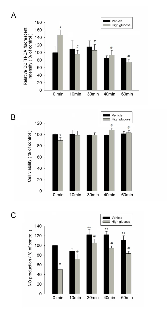 (C) 通過Griess試劑測量了培養基中的硝酸鹽產量(作為NO含量)。高糖抑制了培養的晚期EPCs中的NO產量。在培養4天後,IFR輻射在有或沒有高糖條件下增加了NO產量。(*p < 0.05 與控制-0分鐘比較; #p < 0.05 與高糖-0分鐘比較; **p < 0.05 與控制-0分鐘比較; 每個實驗 n = 4)。