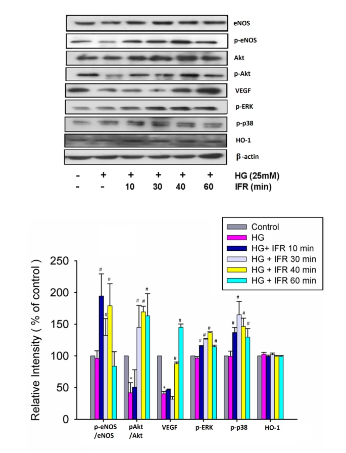 對培養的ECFCs進行10分鐘、30分鐘和40分鐘的IFR輻射後,再用高糖條件處理EPCs,顯著上調了高糖損害的eNOS產量和eNOS活性(p-eNOS/總eNOS)。進行IFR治療30分鐘、40分鐘和60分鐘也上調了Akt的啟動(p-Akt/總Akt)。此外,IFR輻射還促進了高糖條件下的VEGF產量、p-ERK和p-38 MAPK,但HO-1則沒有。每個條形圖顯示了四個獨立實驗的彙總數據,使用光譜密度法進行正常化後。數據是平均值±SEM;每個實驗中n=4。(*p < 0.05與對照組相比;#p < 0.05與HG組相比)。