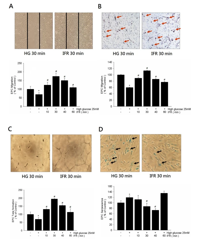 如圖4B所示,用高糖培養基孵育4天顯著減少了EPC的增殖(控制組與高糖組比較,100 ± 2與88 ± 5, p = 0.026)。然而,對EPCs施加IFR輻射40分鐘後,再在高糖條件下處理,可以顯著逆轉高糖對EPC增殖的減少(高糖組與高糖+ IFR 40分鐘組比較,88 ± 5對109 ± 2, p = 0.006)。