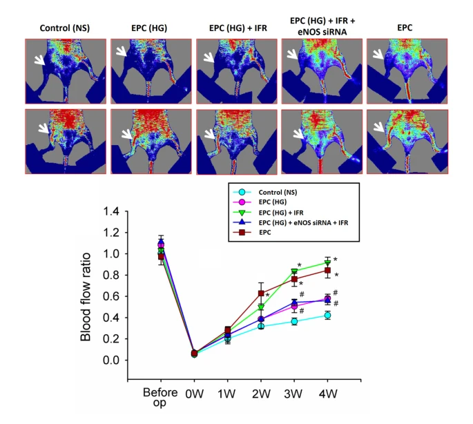 6–8週齡的無胸腺裸鼠由台灣國家實驗動物中心購得。然後,將裸鼠隨機分配到5個治療組(每組n = 6),分別進行肌肉內注射,包括正常生理鹽水、健康EPC、用高葡萄糖處理4天的EPC(EPC-HG)、用高葡萄糖和IFR處理30分鐘的EPC(EPC在高葡萄糖條件下處理4天後的24小時)(EPC-HG + IFR),以及用高葡萄糖處理並轉染eNOS siRNA(Santa Cruz-Biotechnology Inc.,CA,USA)和IFR處理30分鐘的EPC(EPC-HG + eNOS siRNA + IFR)。EPCs標記有螢光碳氰基染料1,1′-二十八烷基-1至3,3,3′,3′-四甲基印青碳氰基氯酸鹽(DiI)染料(Molecular Probes)[21]。單側後肢缺血手術後24小時進行肌肉內注射。總體積200微升的正常生理鹽水或5 × 10^6個EPC被注射到動脈閉塞部位以下的缺血後肢的6個部位。三個腹側注射位於靠近拈肌和半膜肌的上肢。其餘3個注射則注入涉及腓腸肌和屈指深肌的腹側下肢。為了達到最大的實驗一致性,移植的EPC均來自相同的捐贈者,並在平行實驗中使用。